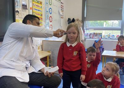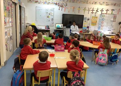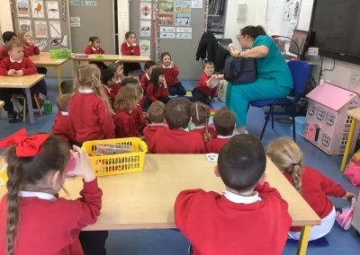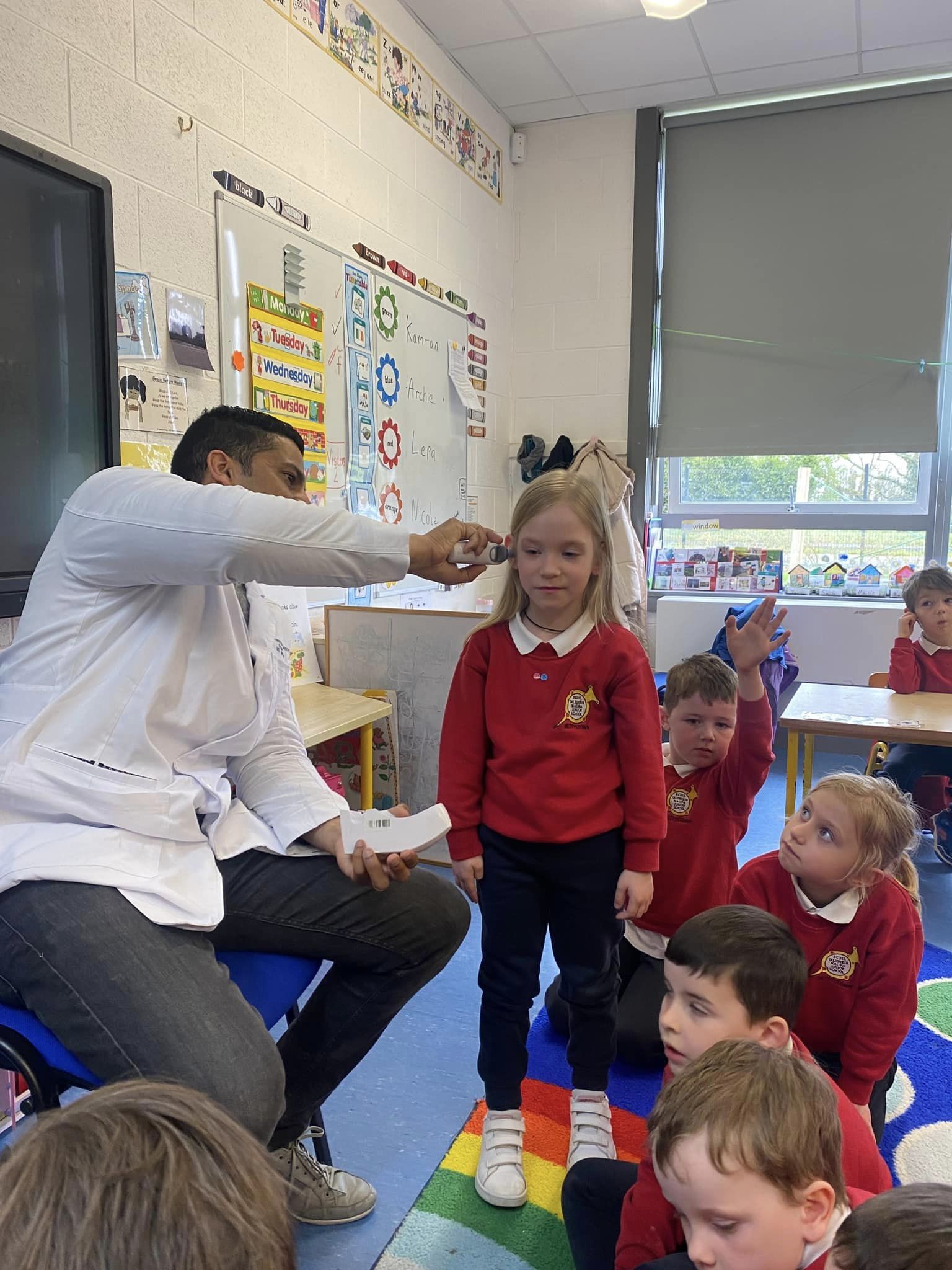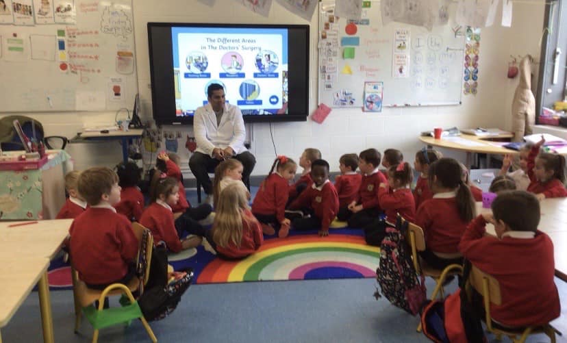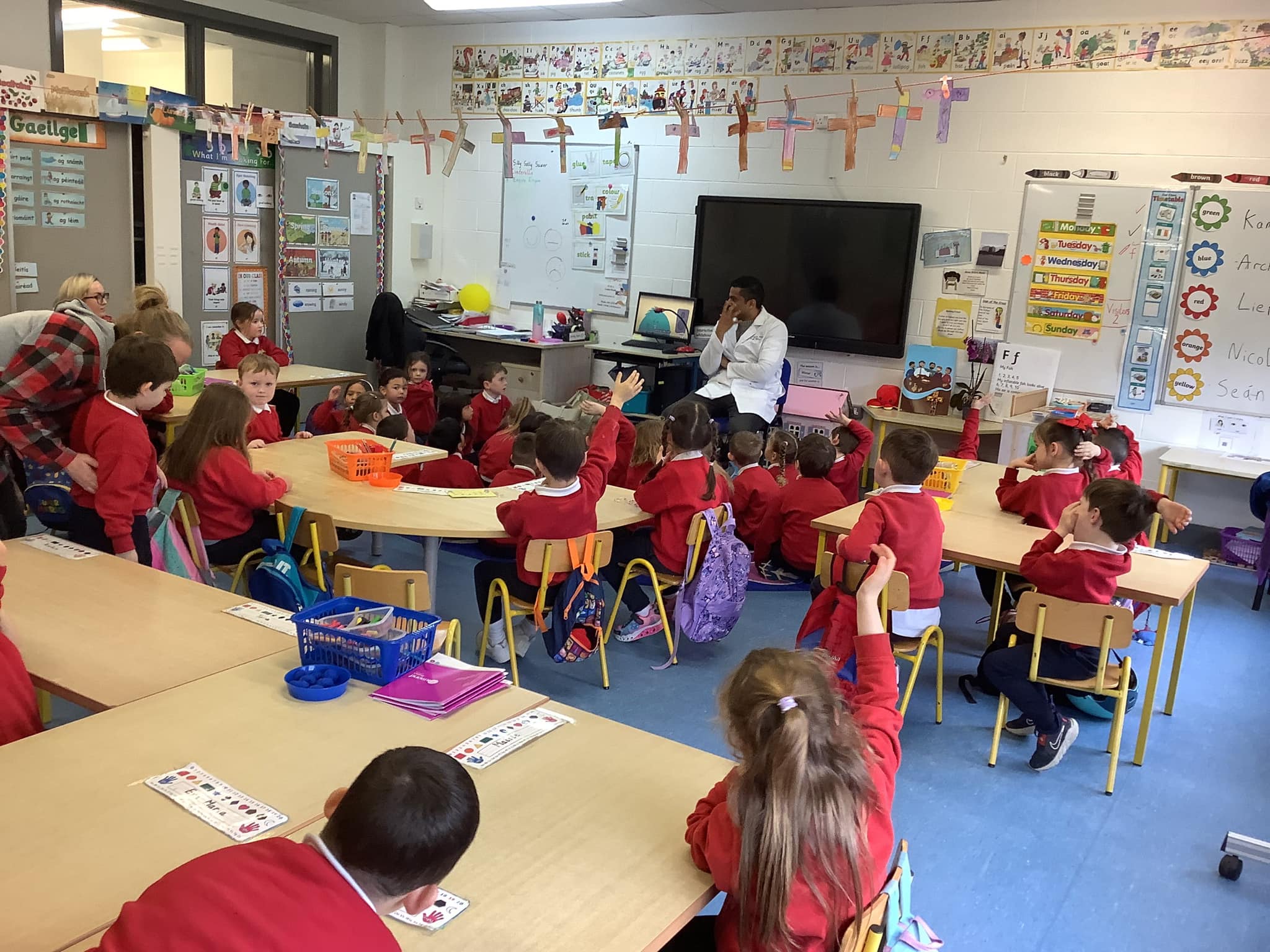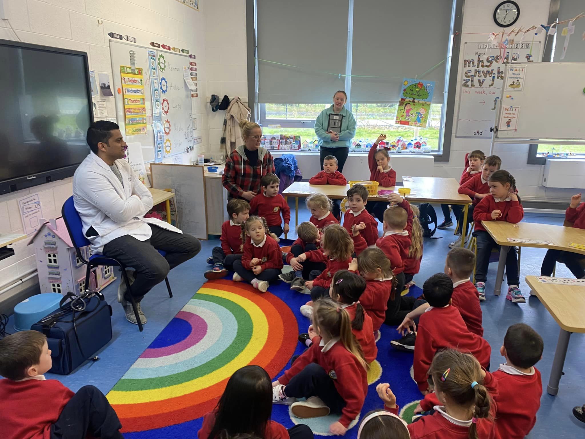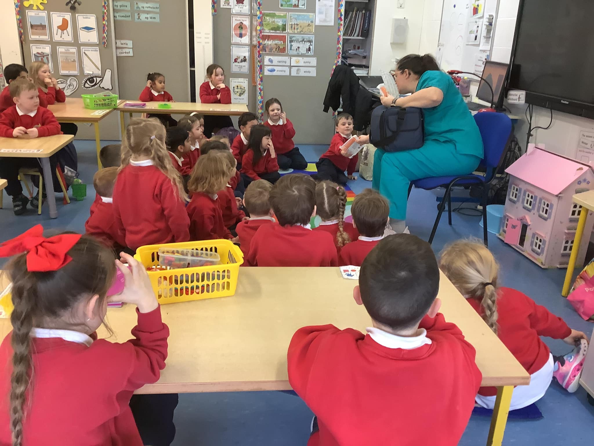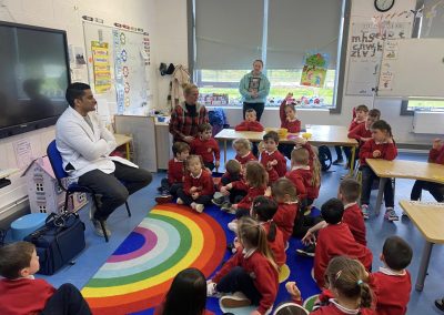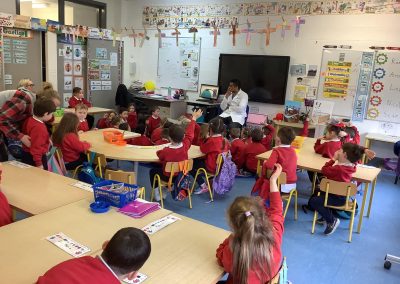 Junior Infants have been learning about people who help us. A big thank you to two of our parents who came in to talk to the children. Nurse Aoife talked about how she helps people in the community and Dr. Naidoo talked about being a GP! The children enjoyed asking them questions and hearing how they help people!